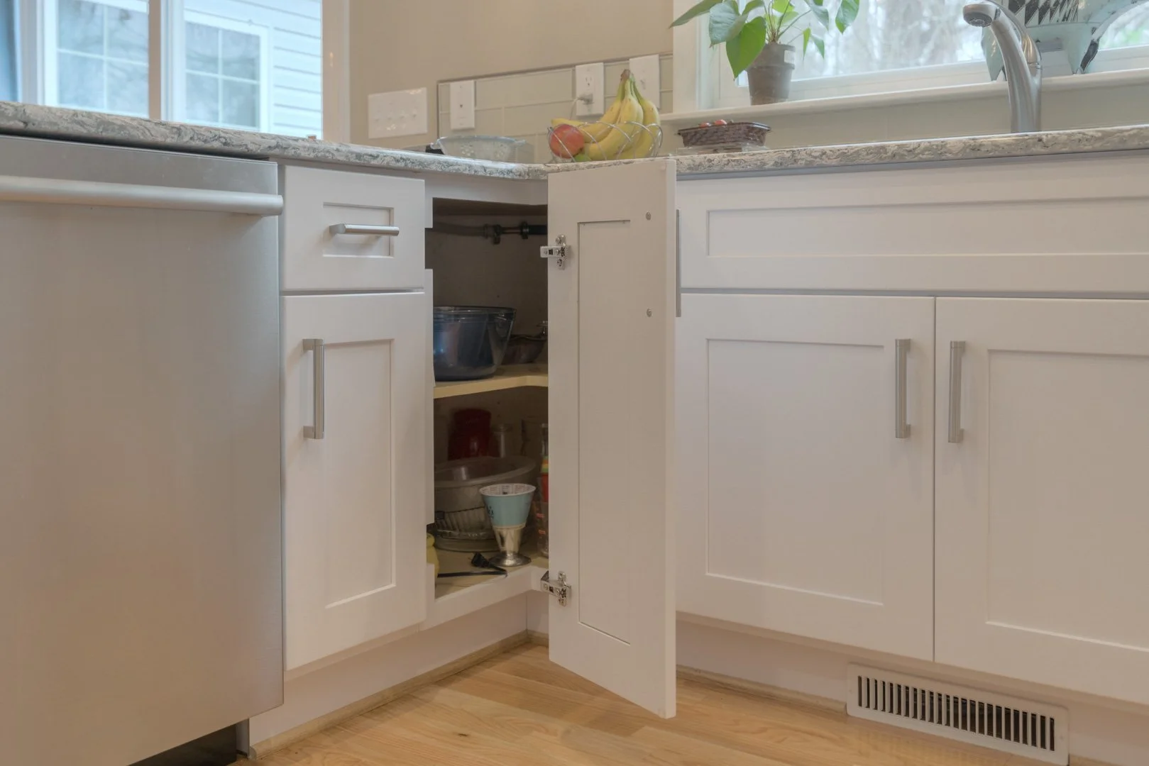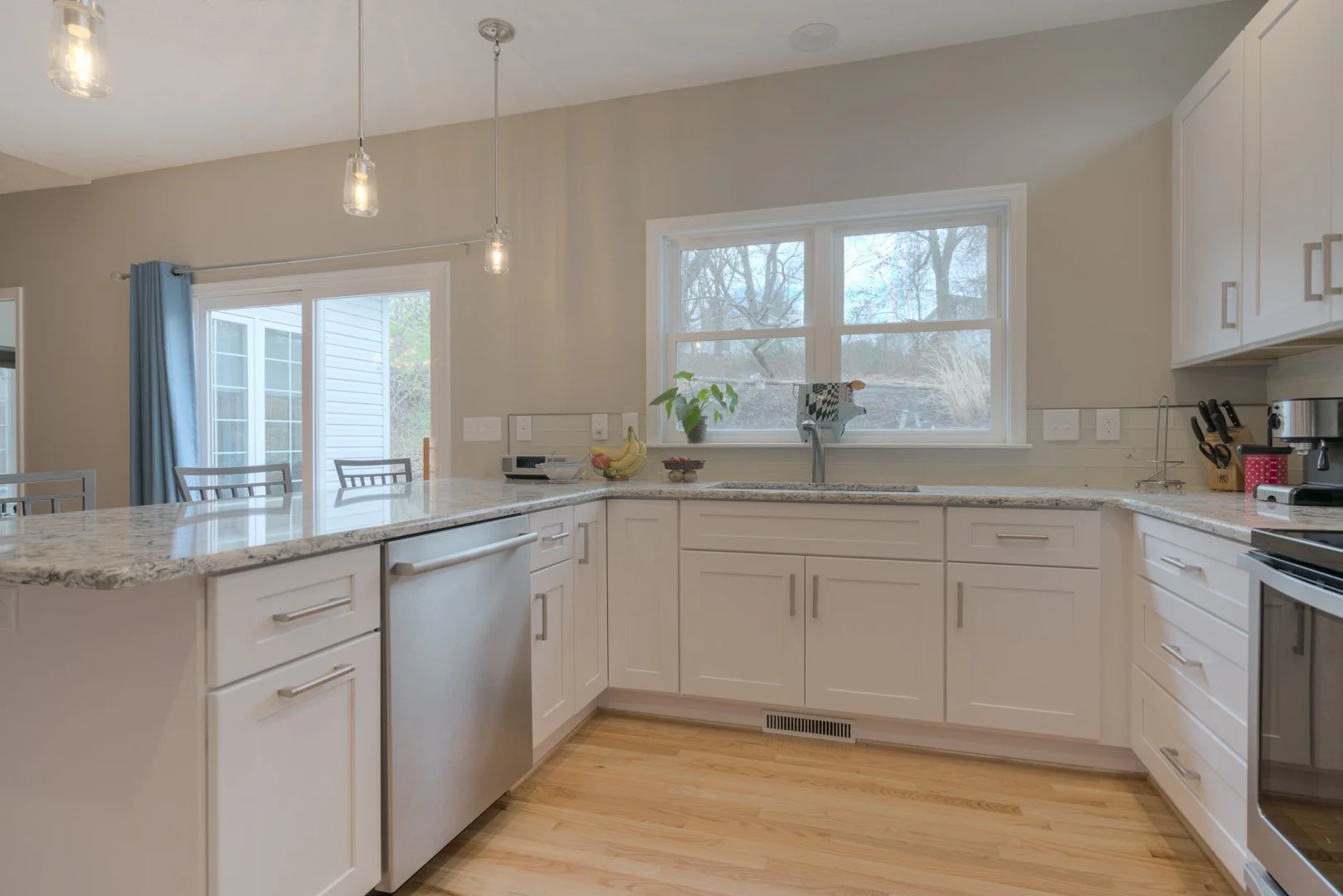 This kitchen received a major upgrade in style, layout and light! We removed the awkward pantry that was blocking the kitchen from the rest of the living area and reconfigured the layout. New transom windows were added above the cabinets, and the single window over the sink became a double, which improved the light and feel of the entire space. The white shaker cabinets, quartz countertops and glass backsplash all brighten and modernize the space, yet the color scheme is still warm and comfortable. We carried the existing wood floors into the new kitchen to tie everything together.
