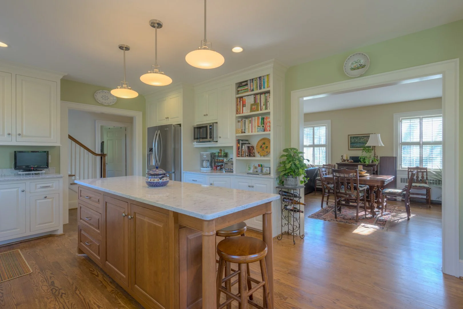 We took down the wall between the existing TINY kitchen and dining room and created a grand kitchen that suited this historical cape cod. The cherry island with seating is the perfect centerpiece, and the bar area makes this an entertainer’s dream!