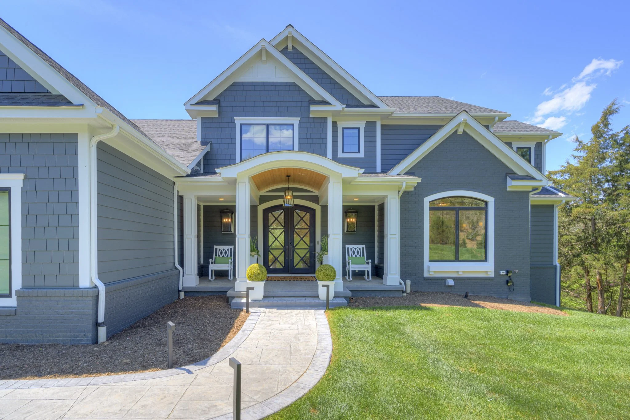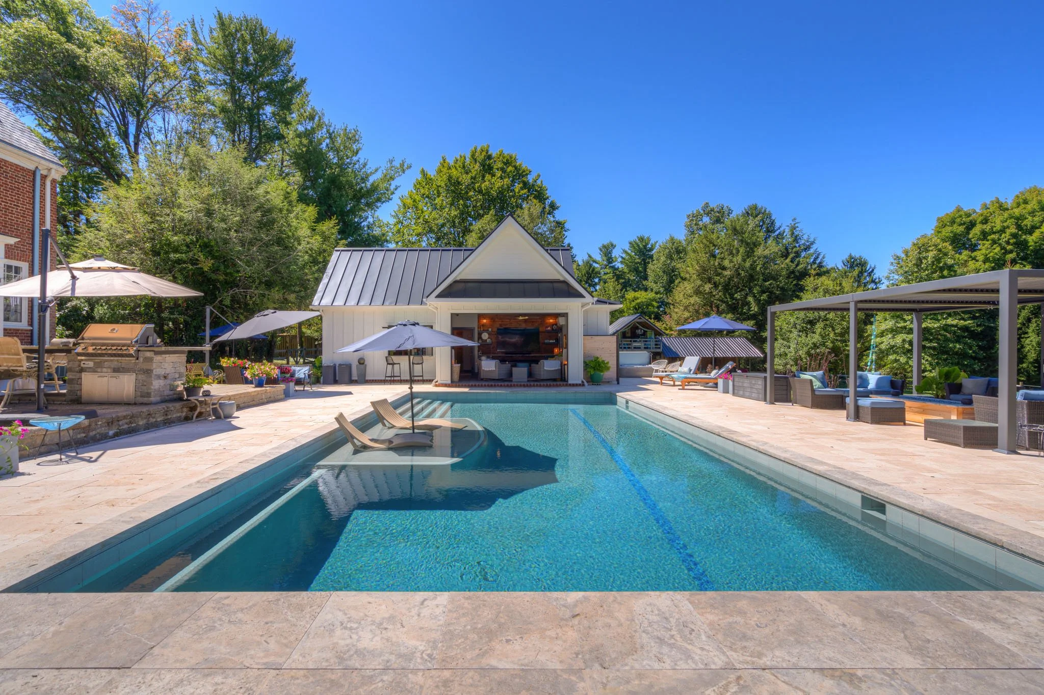 This project brought everyone’s backyard paradise to life- and it all centers around the pool! The new pool and surround anchor the middle of the newly created courtyard, with beautiful imported stone, integrated tanning ledge, and a new gathering space with pergola and firepit. One side of the pool has the perfect pool house- with living room, electric fireplace, kitchenette, snack bar, guest bath, steam shower and custom sauna. The hot tub is nestled right outside as well!